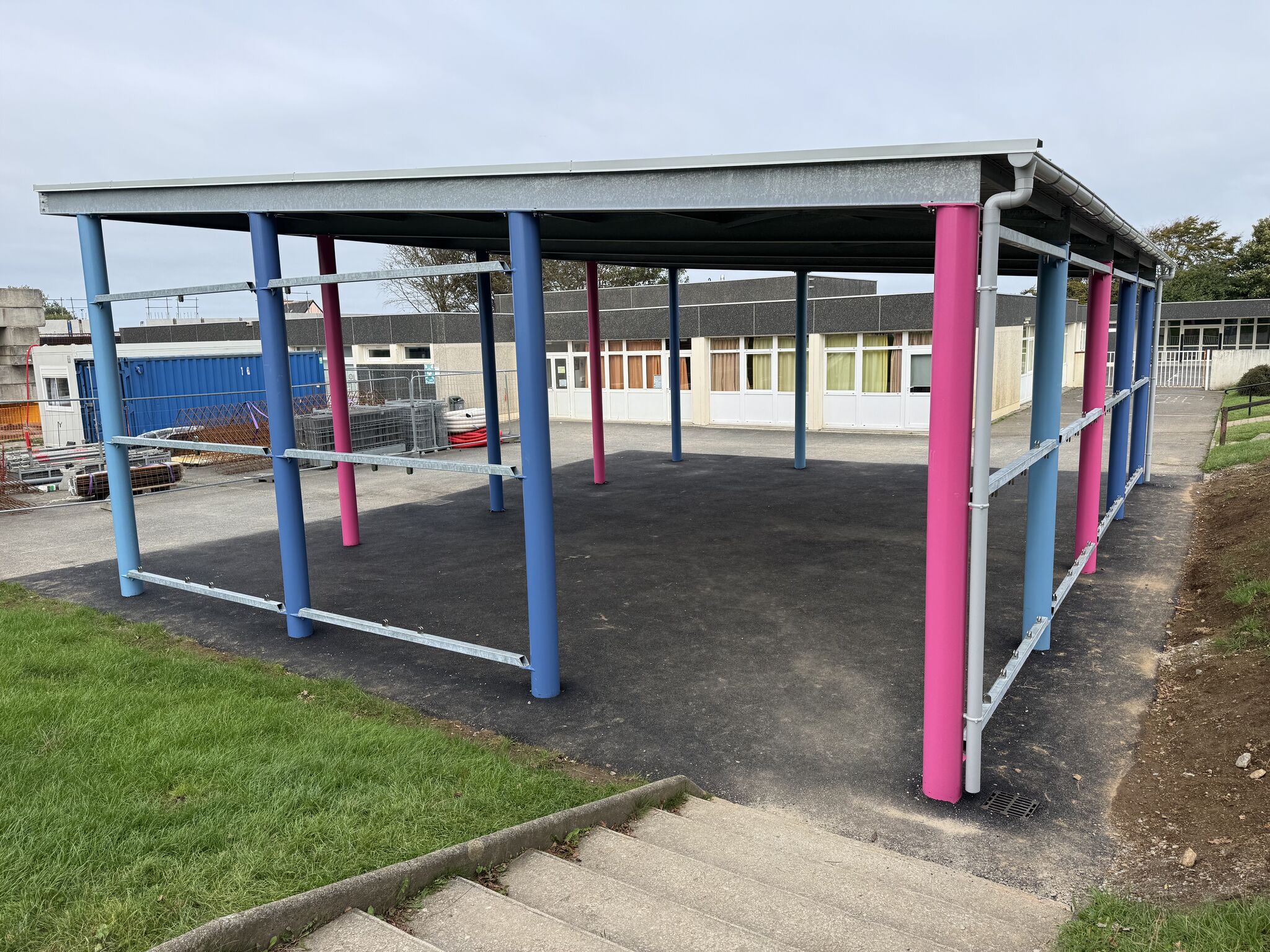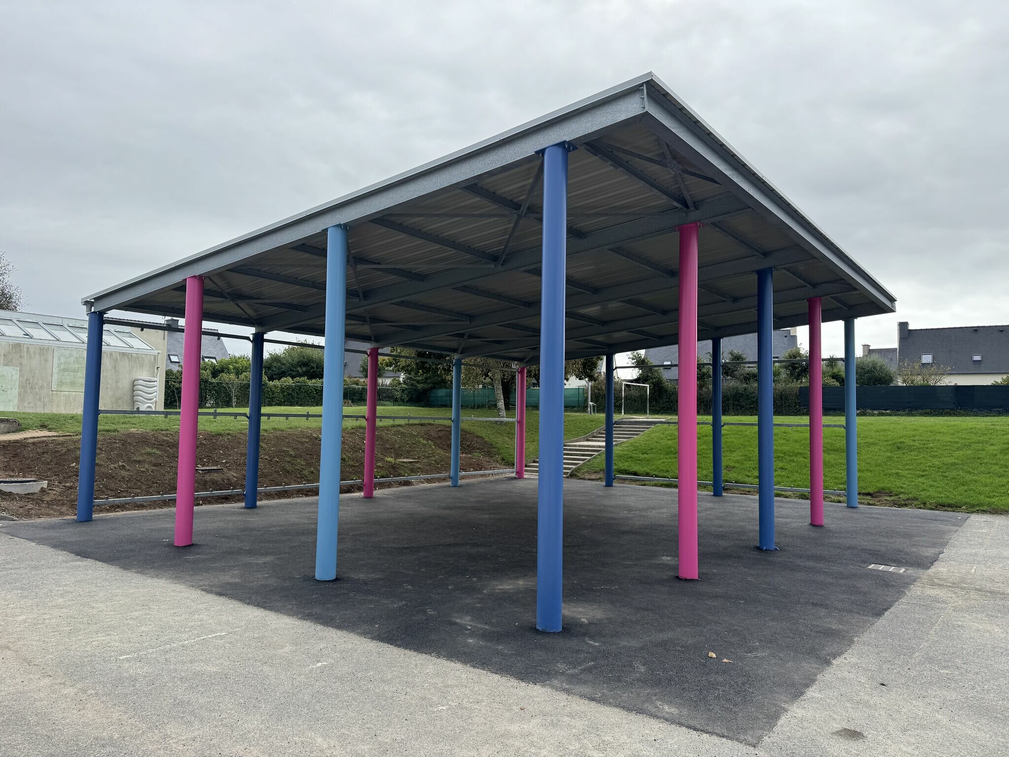 Ce préau permet aux élèves de bénéficier d’un espace couvert, idéal pour les temps de récréation et les activités extérieures, avec une protection efficace contre la pluie et le vent.